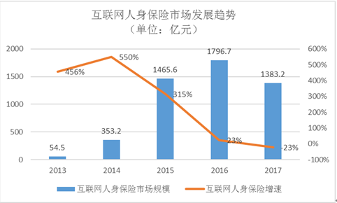 总体来看,中保协指出,“2017年互联网人身保险市场规模发展势头放缓”,全年累计实现规模保费1383.2亿元,同比下滑23%。值得关注的是,相比2013-2015年间三位数的高速增长,以及2016年保费增速放缓且逐月下降的趋势,去年保费增速出现近年以来的首次负增长。
